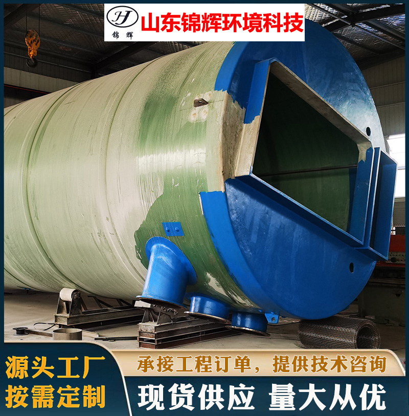 泵站筒體結構由纖維纏繞玻璃鋼(GRP)制成,采用意大利(VEM)公司設備,全自動化控制連續纏繞型,確保厚度均勻并達到設計的剛度,質量穩定優良 。